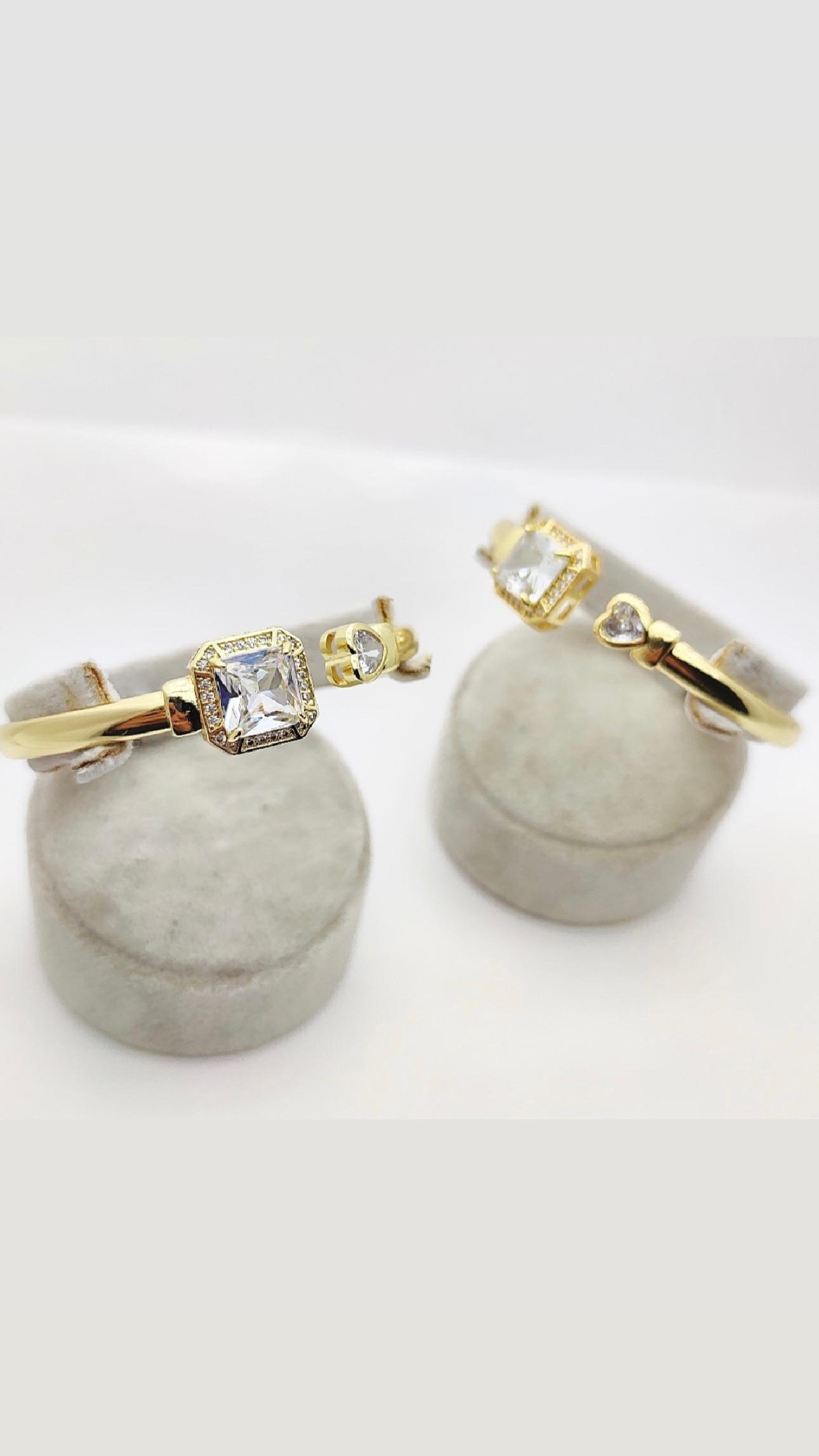 Zarif tasarımıyla öne çıkan bu kelepçe, kare kesim büyük taşı ve yanındaki kalp formundaki taş detayıyla şıklığı tamamlıyor. Altın kaplama yapısı uzun süre parlaklığını korurken, romantik tasarımı sayesinde hem günlük hem de özel davetlerde zarif bir aksesuar olarak kullanılabilir.