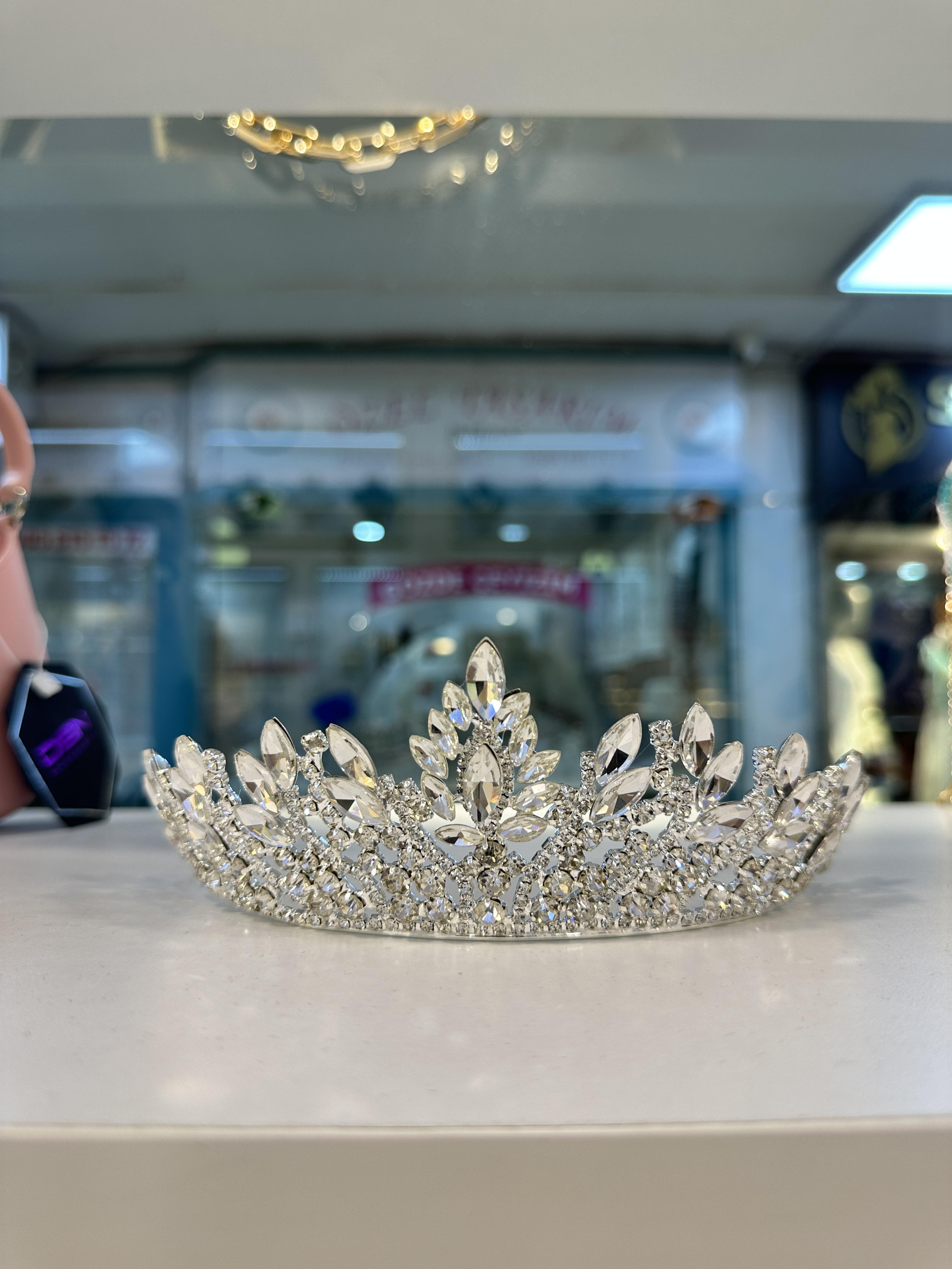 Taç formunda asil bir görünüm sunan bu ürün, iri taşlı ve yaprak formundaki dizaynıyla özel günler için şıklığı tamamlar.